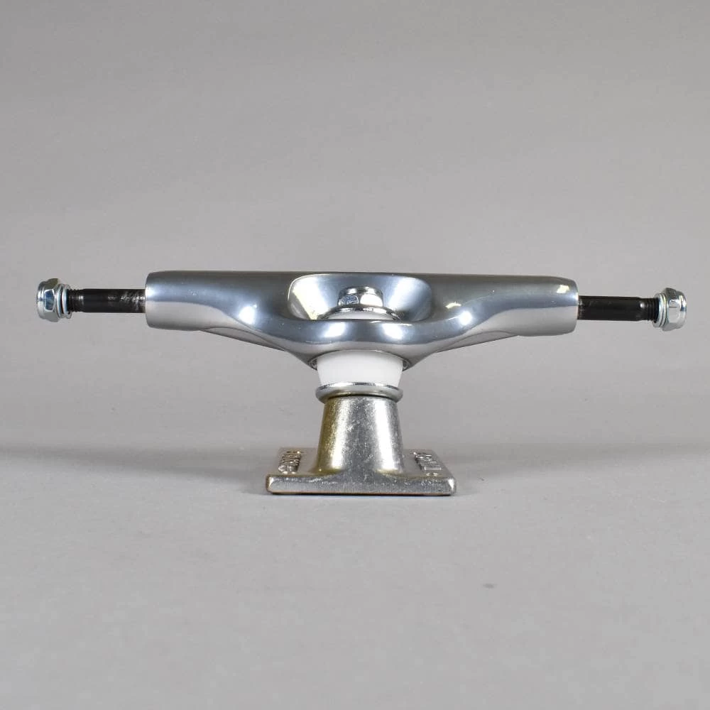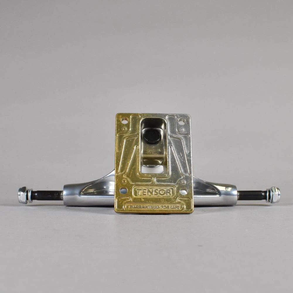 Tensor Aluminum Stencil Mirror Skateboard Trucks Features: Stecil Mirror Trucks. Aluminum Construction. 8.0” Axle. 5.25” Wide Hanger. Pair of Trucks. Colour – Raw/Gold Fade. For Boards 7.75” – 8.125” Approx. Buy Tensor Trucks online at Native Skate Store.